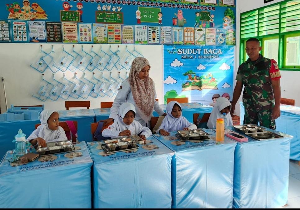 Setelah itu, pukul 09.35 Wita, ratusan siswa menerima menu bergizi dengan tertib. Di sisi lain, Babinsa menjaga keamanan dan kelancaran distribusi di lokasi.