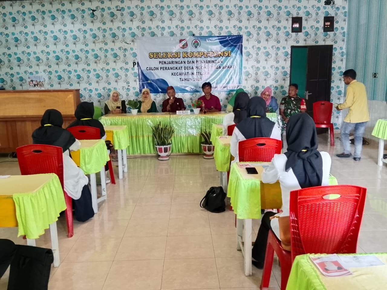 Lima belas peserta duduk rapi sesuai formasi jabatan masing-masing. Beberapa terlihat fokus pada kertas ujian, sementara yang lain menarik napas panjang sebelum memulai. Semua datang dengan tujuan mengabdi di tempat mereka lahir dan tumbuh.