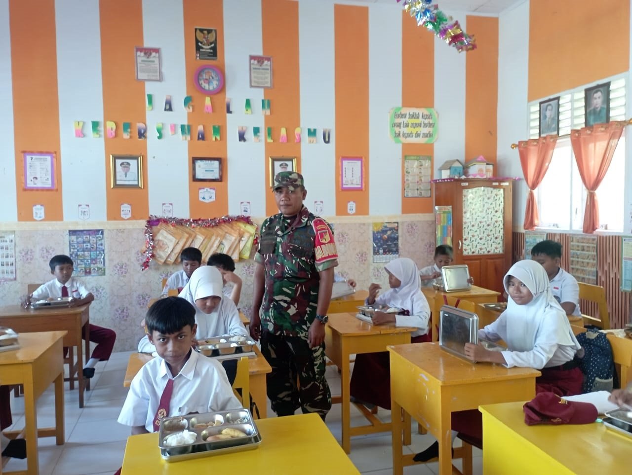 Babinsa Telaga Dampingi Pembagian Makanan Bergizi Gratis Untuk Siswa Sekolah