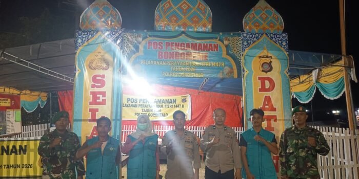 Gorontalo, 20 Maret 2026 – Kegiatan pos pengamanan Idulfitri 1447 H Tahun 2026 berlangsung pada malam hari di Simpang Empat Telaga Park.