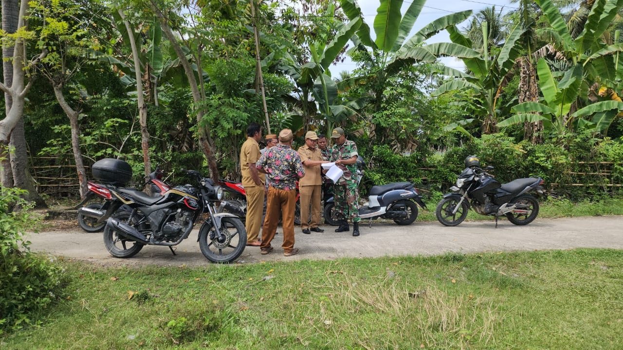 Sertu Mujiono, Babinsa Koramil 1315-01/Telaga, bersama pejabat desa dan kecamatan mendampingi. Kehadiran Yahya, S.E., Kepala Seksi PMD, Sudianto Rivai, Kepala Desa, Harianto Amrain, Ketua LPM, dan Toni, Kepala Dusun 3, memperlihatkan koordinasi TNI, pemerintah, dan warga. Diskusi persiapan pembangunan berlangsung lancar, sehingga transisi dari pembukaan ke pengamatan lapangan berjalan mulus.