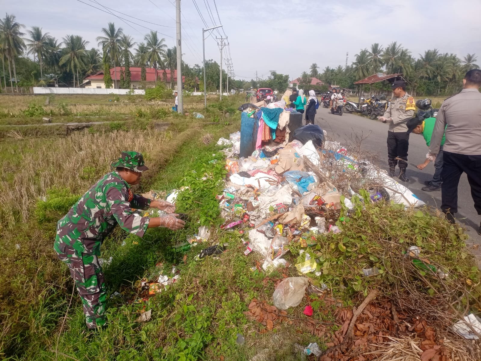 Sementara itu, aparat TNI, kepolisian, tenaga kesehatan, serta perangkat desa ikut ambil bagian dalam kerja bakti. Selanjutnya, seluruh peserta mengumpulkan sampah serta merapikan lingkungan sekitar TPS. Dengan demikian, suasana kebersamaan terlihat kuat selama kegiatan berlangsung.