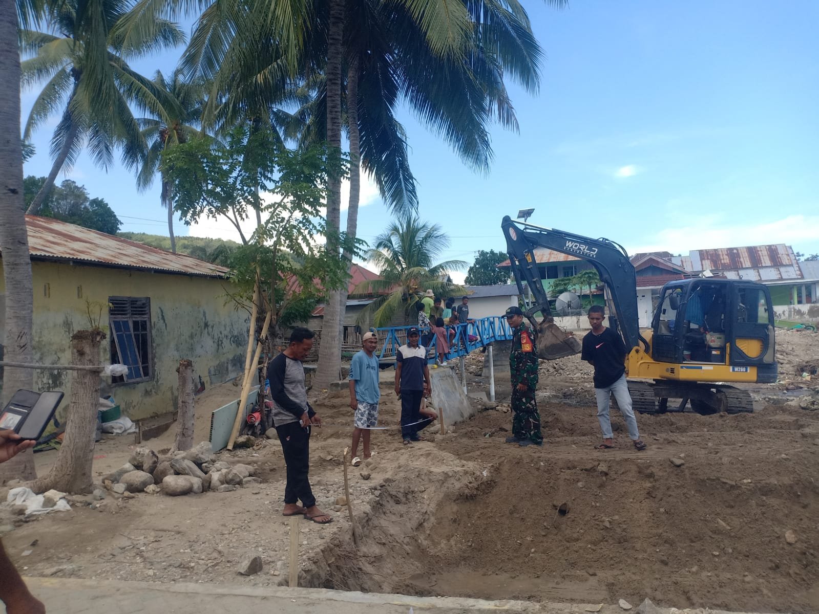 Gorontalo, 5 April 2026 – Dalam mendukung pembangunan, Kopda Sholeh Paturodji melakukan pendampingan proyek jembatan gantung. Kegiatan berlangsung di Sungai Biluhu Timur, Kecamatan Bone Pantai. Jembatan memiliki panjang 20 meter dan masih tahap awal. Progres mencapai 6 persen dengan pekerjaan penggalian dan pemasangan struktur awal.