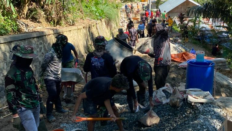 Pagi itu, suara molen berpadu dengan tawa anak-anak. Prajurit Satgas bersama warga mengangkat ember semen tanpa jeda. Dengan demikian, semua bergerak seirama, menata batu dan meratakan adukan sambil menciptakan keakraban hingga ke akar rumput.