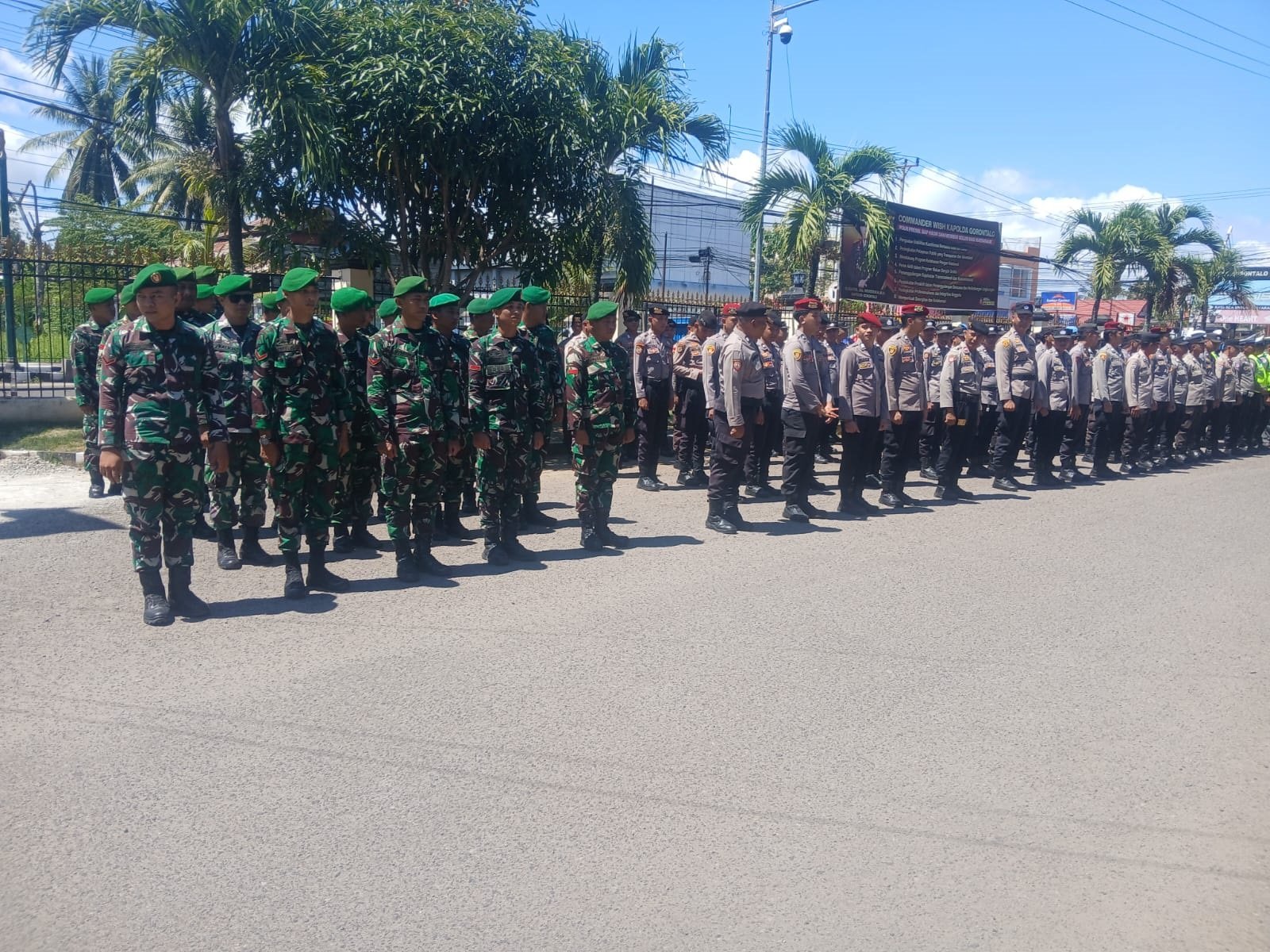 Apel di mulai pukul 10.15 Wita, di pimpin Wakapolres Kompol R. Dianungraha, S.I.K., di dampingi satu SST Kodim 1315/Kabupaten Gorontalo. Selain itu, Kapten Inf Indra Mooduto hadir sebagai Pasi Ops Kodim. Kehadiran aparat menunjukkan koordinasi yang solid antara TNI dan Polri.