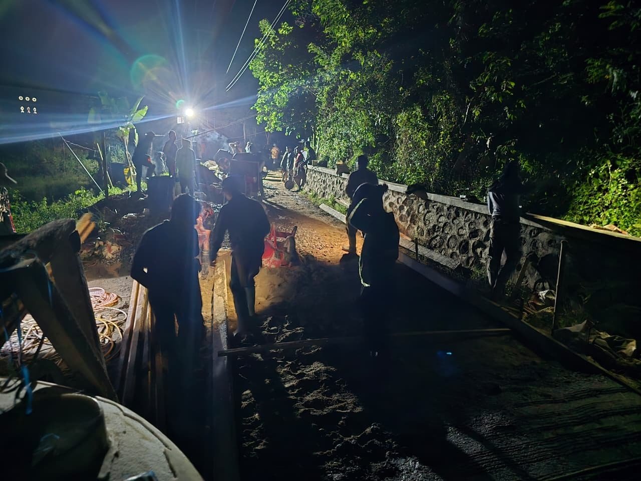 Selanjutnya, koordinasi berlangsung tanpa henti sejak pagi hingga malam. Tim meratakan tanah, menata material, dan menyiapkan logistik. Ketika hujan reda, pekerjaan tetap berlanjut, membentuk ritme kerja produktif dengan tawa ringan menyelingi.