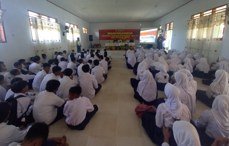 Selanjutnya, kegiatan berawal pukul 08.30 Wita dan berlangsung hangat. Para guru turut mendampingi siswanya, menandakan sinergi antara dunia pendidikan dan TNI. Suasana aula terasa hidup, penuh rasa ingin tahu, seolah membentuk energi belajar yang menyatu antara pendidik dan pelajar.
