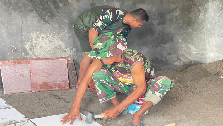 Pagi itu pemandangan menyentuh hati terlihat jelas: prajurit dan warga bekerja tanpa sekat. Ada yang menyiapkan adukan semen, ada yang menata ubin, sementara anak-anak tersenyum dari balik jendela. Peluh mengalir, namun wajah mereka menampakkan kepuasan karena setiap keramik berarti satu langkah menuju kehidupan lebih baik.