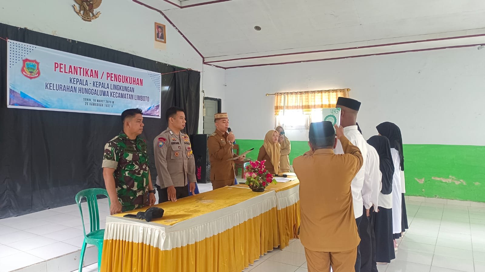Gorontalo, 16 Maret 2026 – Pemerintah Kelurahan Hunggaluwa menggelar pelantikan kepala lingkungan pada Senin pagi pukul 10.00 Wita. Kegiatan berlangsung pada Kantor Kelurahan Hunggaluwa, Kecamatan Limboto, Kabupaten Gorontalo. Selain itu, Sertu Rahmansyah Babinsa Koramil 1315-02 Limboto hadir bersama aparat kelurahan sehingga forum berjalan tertib serta khidmat.