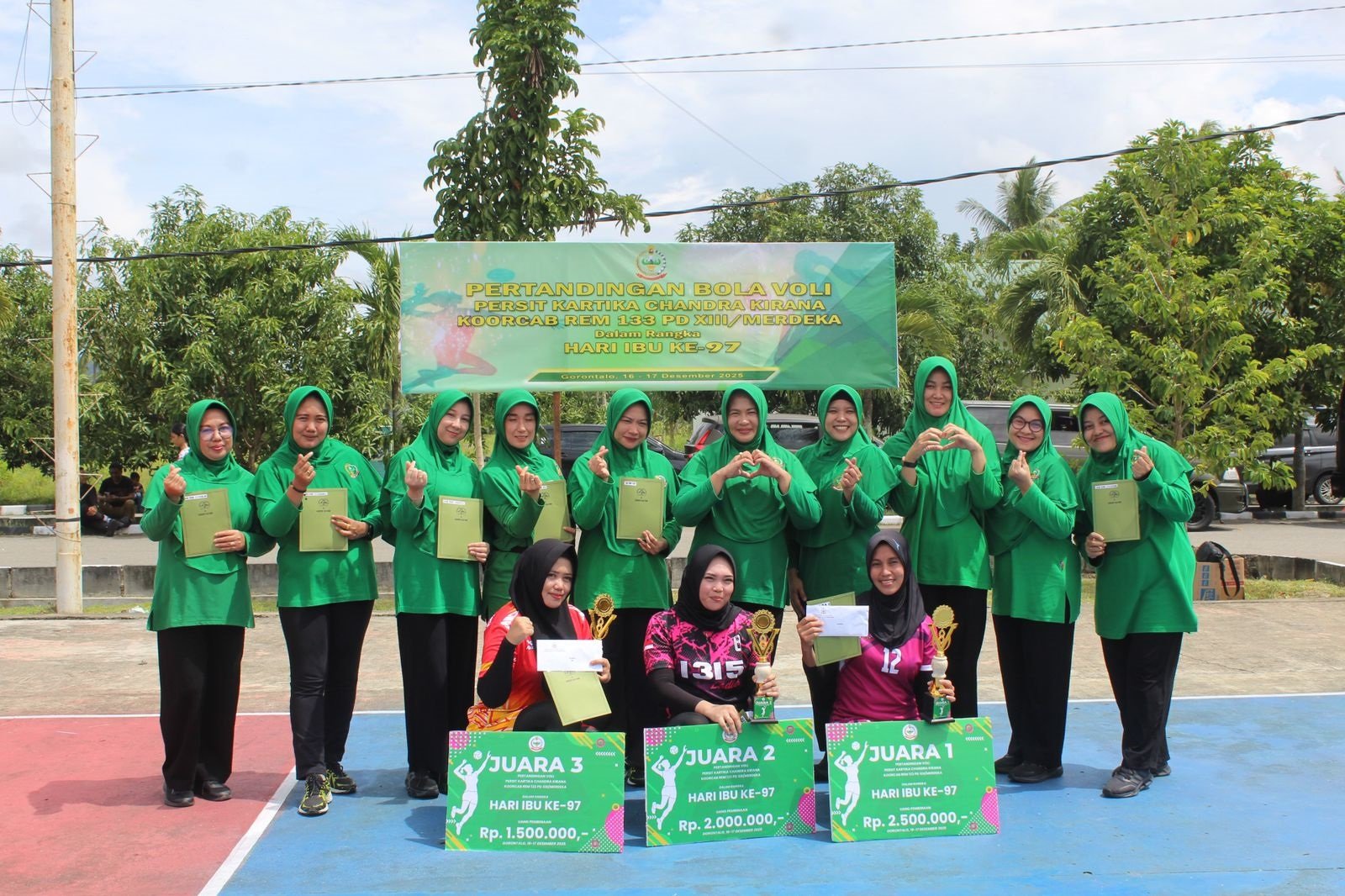 Hingga akhirnya, hasil pertandingan menempatkan tim Persit Kodim 1315 sebagai juara dua. Dengan demikian, mereka menerima piala dan hadiah uang pembinaan dari Danrem 133/Nani Wartabone, Brigjen TNI Hardo Sihotang, sebagai bentuk apresiasi.