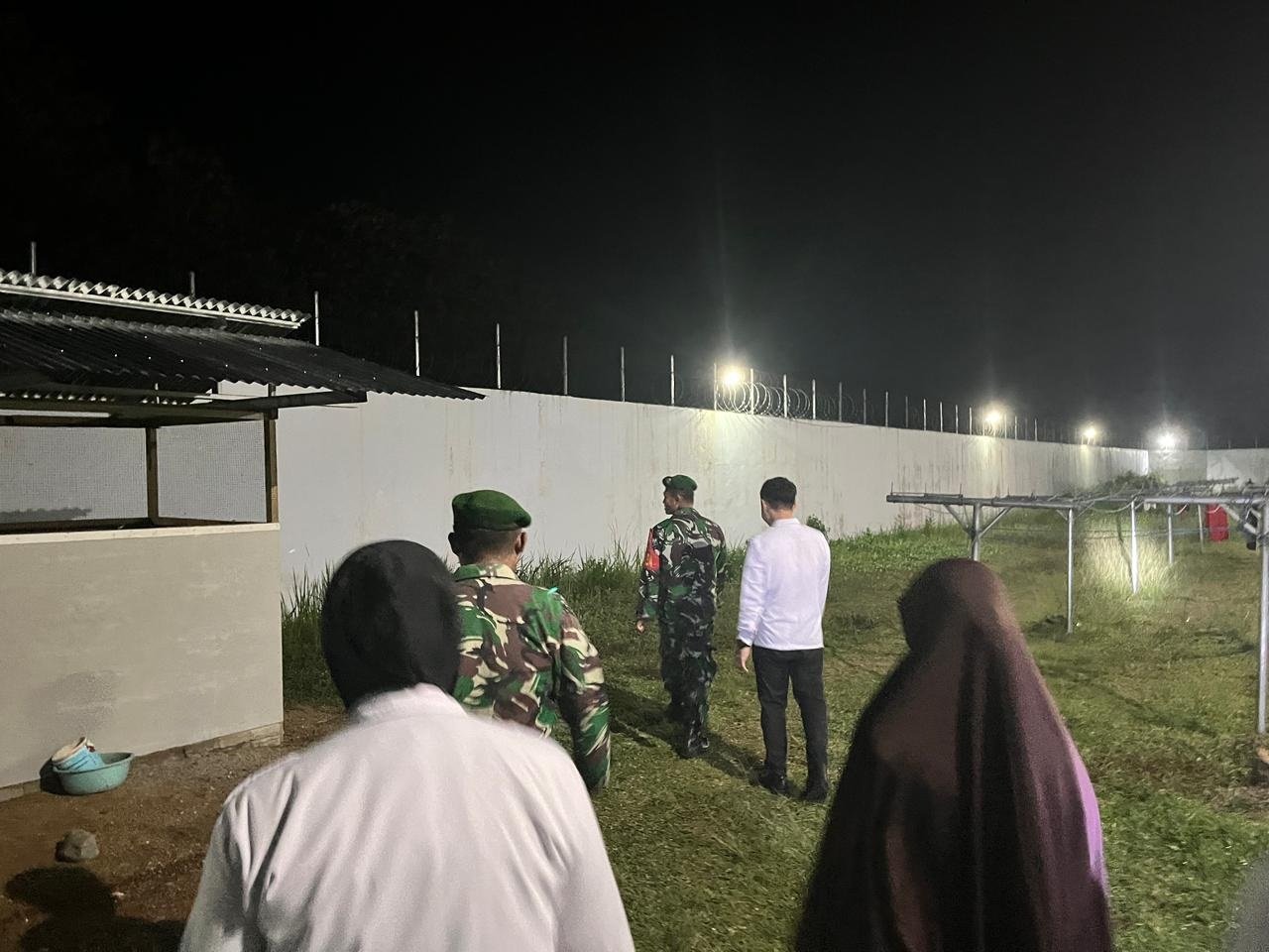 Lampu halaman lapas menambah kesan khidmat di malam temaram. Selain itu, personel TNI dan petugas lapas berjalan teliti menyusuri pagar dan sisi lapas. Dengan demikian, disiplin dan tanggung jawab terasa dalam setiap langkah patroli.