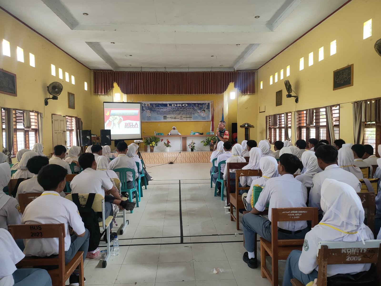 Telaga Biru, 17 November 2025 — Sertu Jalil memasuki aula SMA Negeri 1 Telaga, mendapat sambutan puluhan mata penuh perhatian. Hari itu, siswa mengikuti Latihan Dasar Kepemimpinan OSIS 2025–2026. Dengan demikian, suasana siap untuk menyerap ilmu dari Babinsa yang hadir.