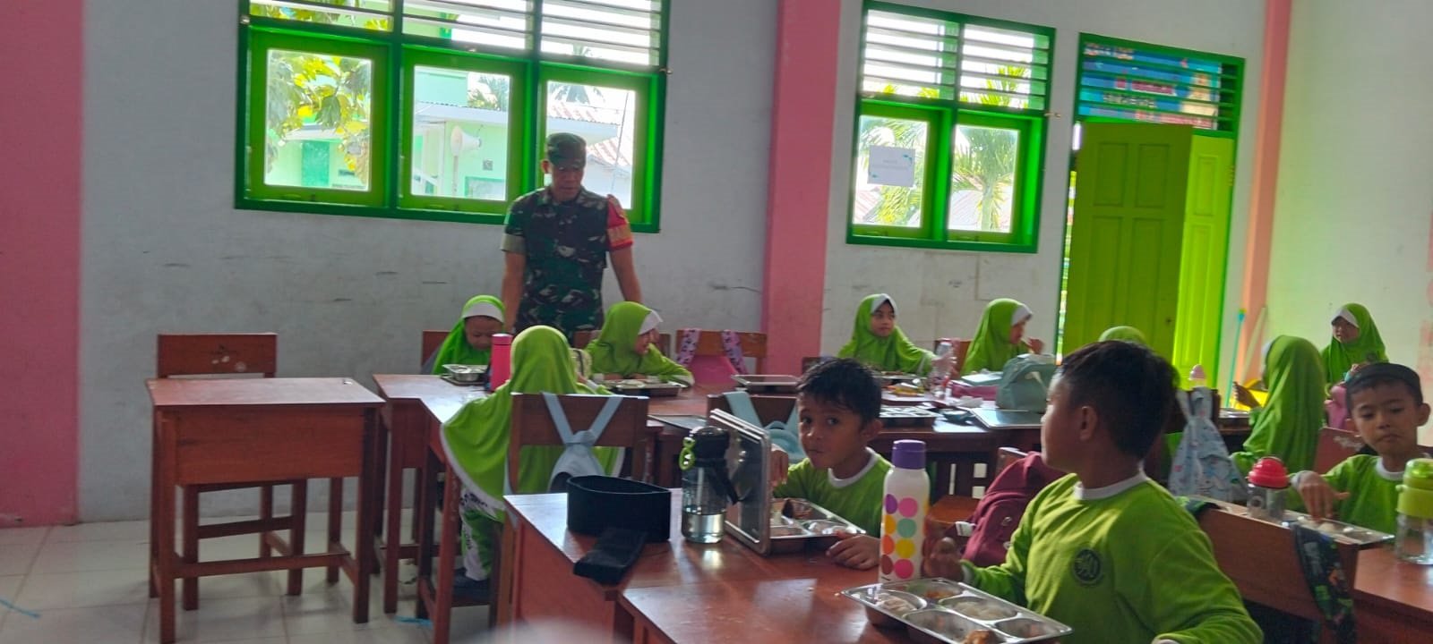 Santapan bergizi tersaji hangat berupa nasi, ayam goreng, sayur kentang dan kol, serta tempe goreng. Sementara itu, tawa anak-anak yang menikmati makanan menjadi pemandangan menyenangkan bagi para guru.