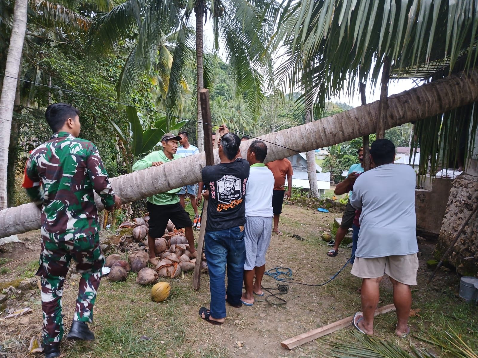 Babinsa Koramil 1315-03/Tabongo datang pukul 16.20 Wita ke rumah Ibu Asiya untuk menindaklanjuti kerusakan akibat pohon tumbang. Ia meninjau lokasi dan memimpin perbaikan awal, sementara warga bergotong royong memperbaiki rumah. Hasilnya, rumah cepat kembali layak huni.