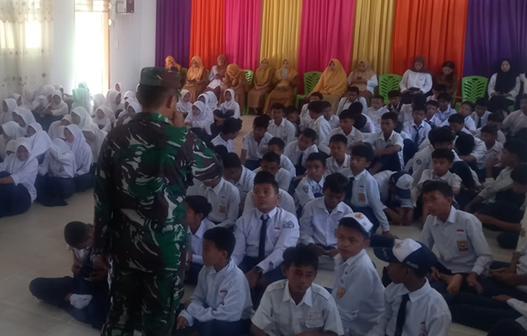 Selanjutnya, kegiatan ini termasuk program non fisik TMMD ke-126 Kodim 1315/Kabupaten Gorontalo. Suasana aula penuh semangat, siswa serius menyimak sementara guru duduk di belakang memberi dukungan. Kehadiran guru menunjukkan kolaborasi antara pendidikan dan TNI membangun karakter generasi muda.
